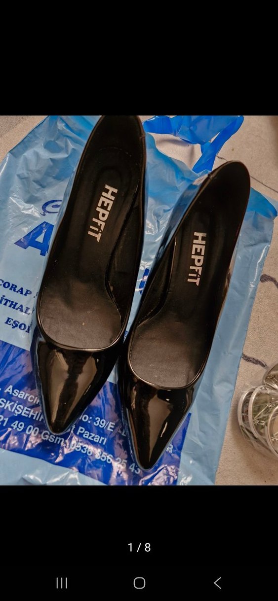 Parlak rugan görünümlü, sivri burunlu siyah yüksek topuklu stiletto, cesur iş tarzına uygun bağcıklı detaylarla.