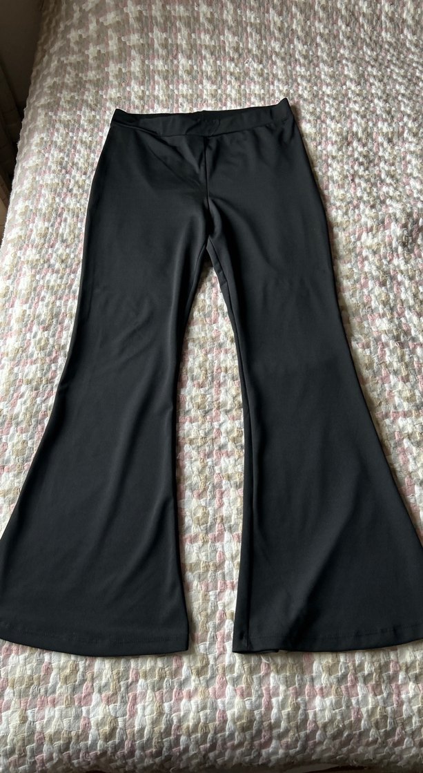 Siyah, dar kesim, sentetik kumaştan uzun ispanyol paça pantolon, salaş ve rahat bir tarz sunar, günlük kullanıma uygundur. 3xl ama kalıbı dar