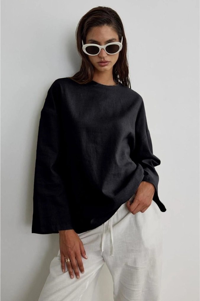 Kadın Siyah Salaş Keten Uzun Kollu Bluz