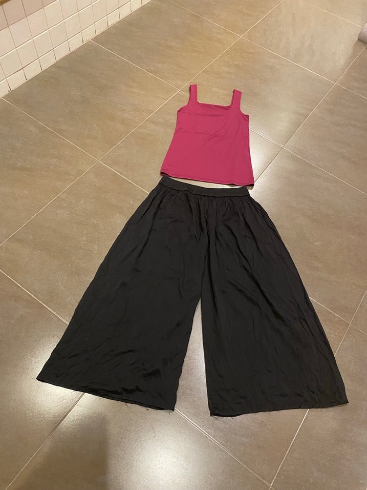 Kadınlar için siyah, saten kumaştan yapılmış salaş midi pantolonlar. Rahat ve şık, normcore athleisure tarzında dış mekan kullanımı için uygundur.