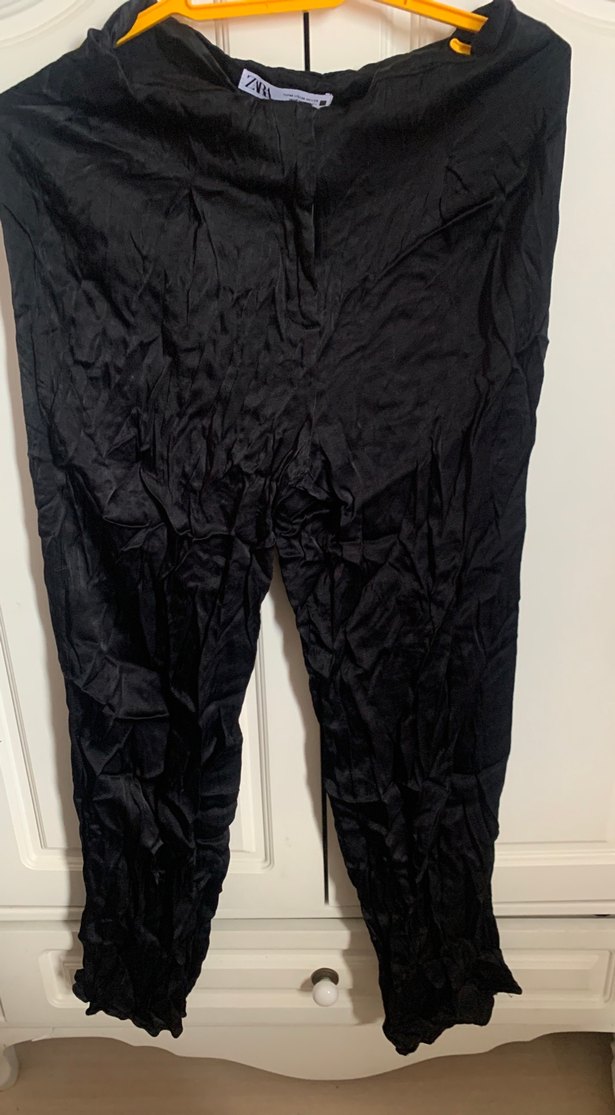 Siyah saten midi boy, bol kesim ve drapeli detaylara sahip, gotik tarzda dış mekan kullanımı için uygun pantolon. ✨