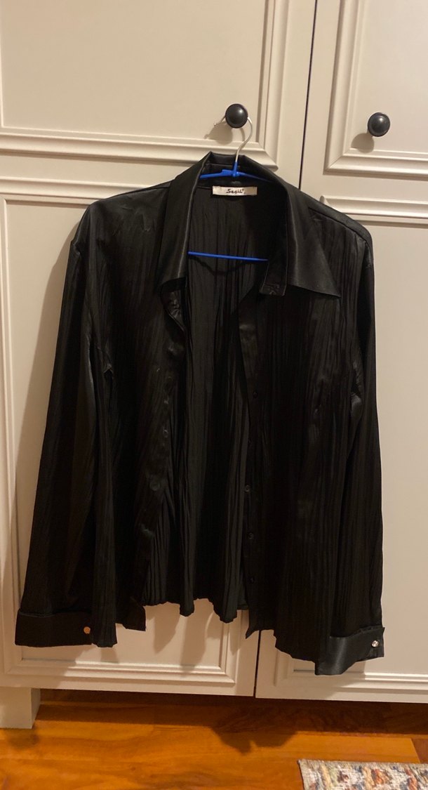 uzun kollu, normal midi boyda, siyah ve desen içermeyen gömlek. Salaş kesimi ve notched lapel yaka detayıyla ofis kullanımı için uygundur. Çok az kullanılmıştır
