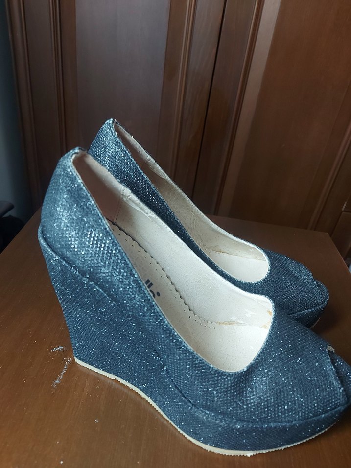 Kadınlar için siyah, simli, dolgu topuklu abiye ayakkabılar. Yılan desenli, çağdaş tarzda, düğün ve özel günler için uygundur. Rahat ve şık.