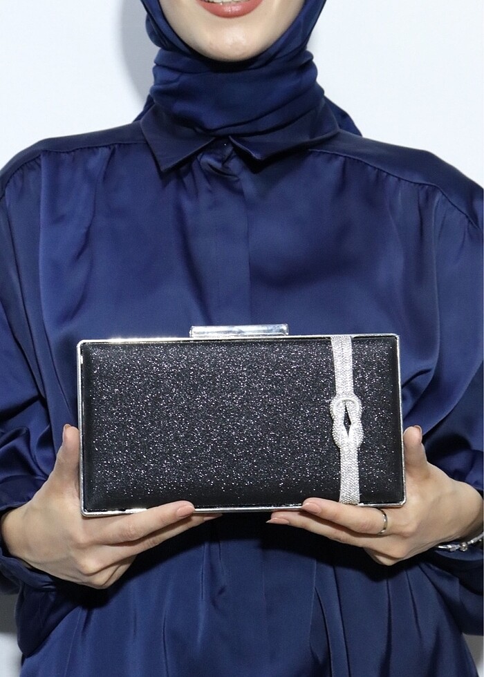 Kadın Siyah Simli Gümüş Şeritli Abiye Çanta