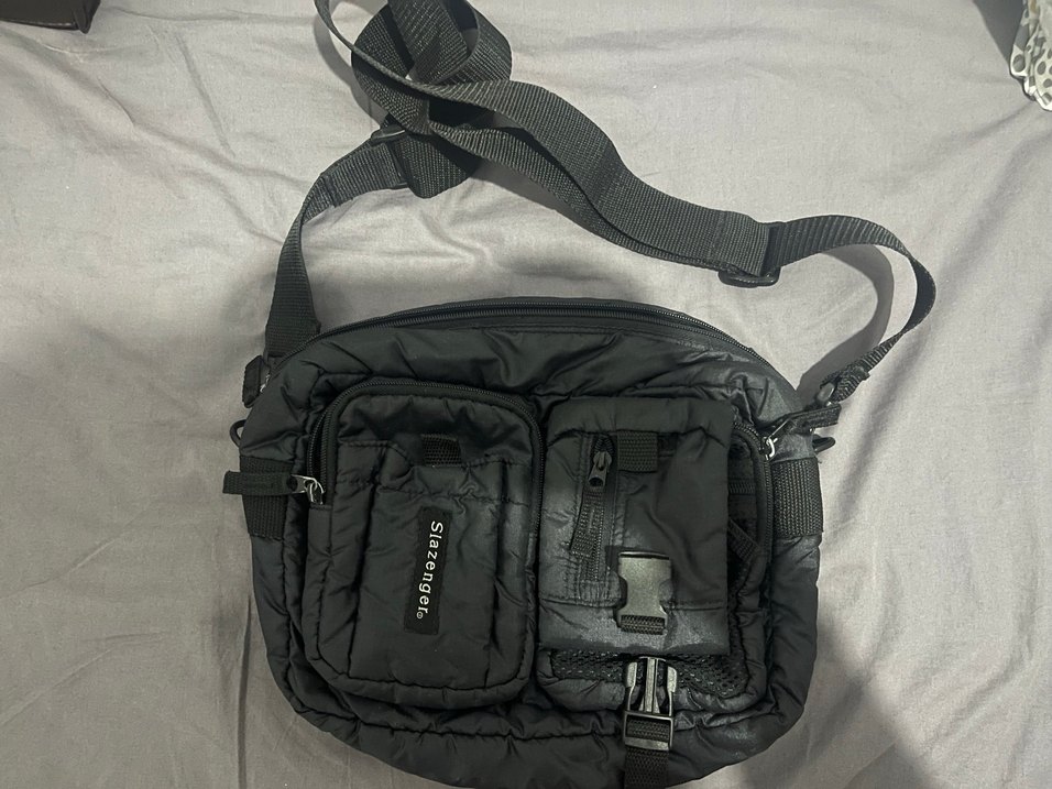 Sentetik kumaştan yapılmış, tokalı cepleri ve ayarlanabilir kayışı olan siyah çapraz çanta, sokak stili ve günlük kullanım için uygundur.