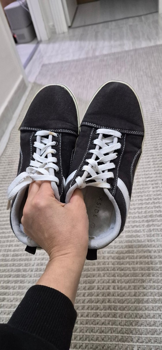 Kadınlar için siyah spor ayakkabı, beyaz bağcıklı ve lastik tabanlı. Sokak stiline uygun, günlük kullanım için ideal.