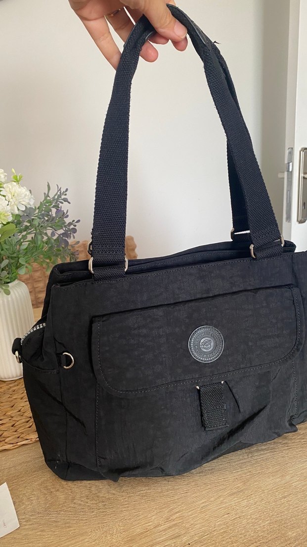 Kadınlar için siyah renkli, fermuarlı ve baskılı desenli sentetik kumaştan yapılmış spor çapraz çanta.