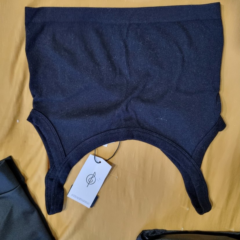Tek renk siyah, tek omuzlu, sportif crop top. Kayık yaka ve tokalı detaylar içerir. Rahat sentetik kumaştan üretilmiştir.