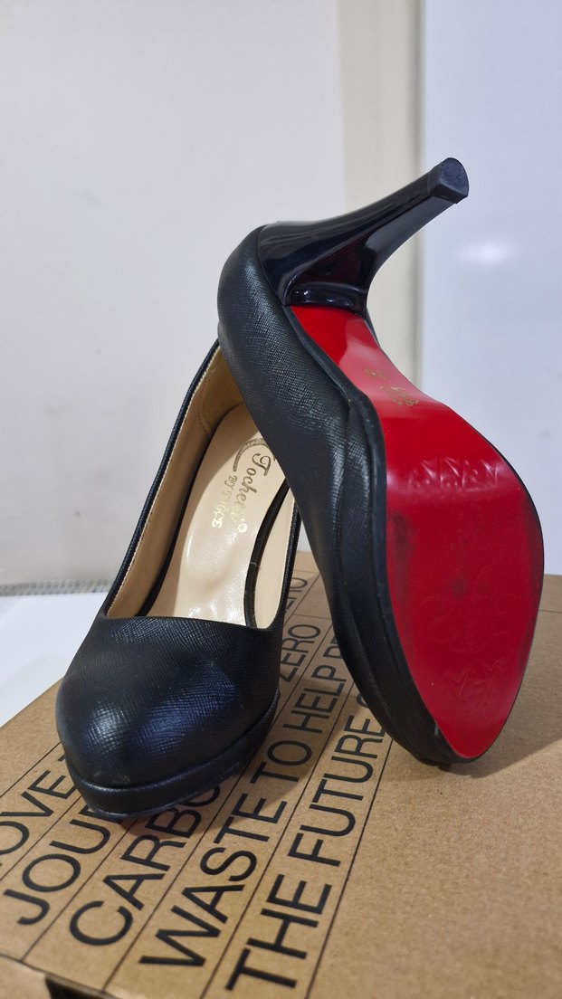 Dayanıklı kauçuk malzemeden, tokalı detaylı siyah stiletto topuklu ayakkabılar. Klasik modern tarzda, ofis kullanımı için uygun, baskılı dokuya sahip. Marka: Tochetti. Birkaç kez giyildi.