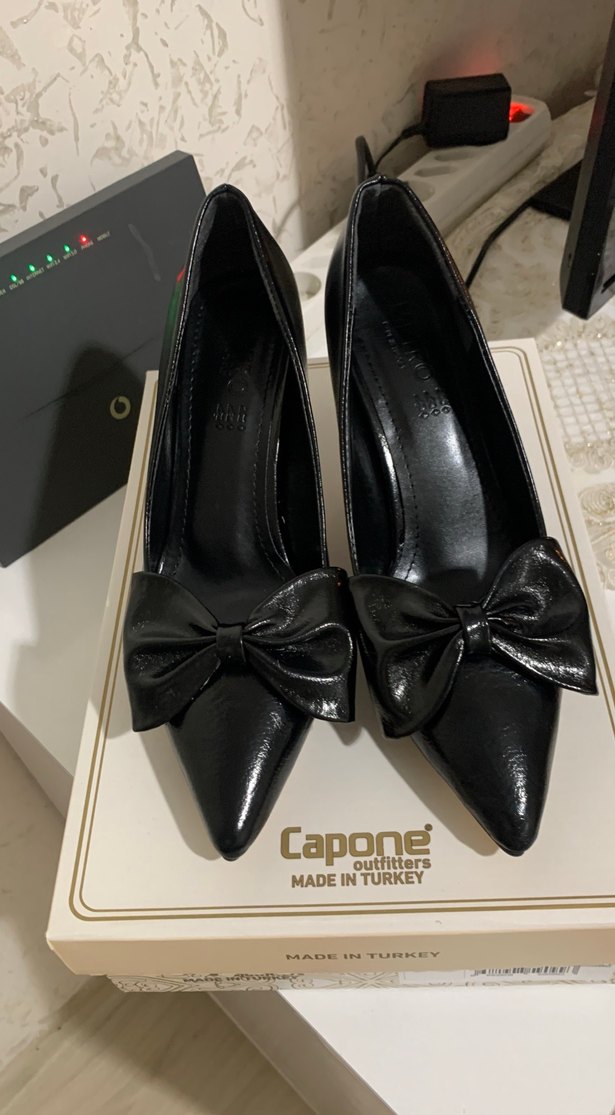 Lastik malzemeden siyah stiletto topuklu ayakkabılar, fiyonklu detaylı. Gotik tarzda klasik şıklık, ofis kullanımı için uygun. Marka: Capone.