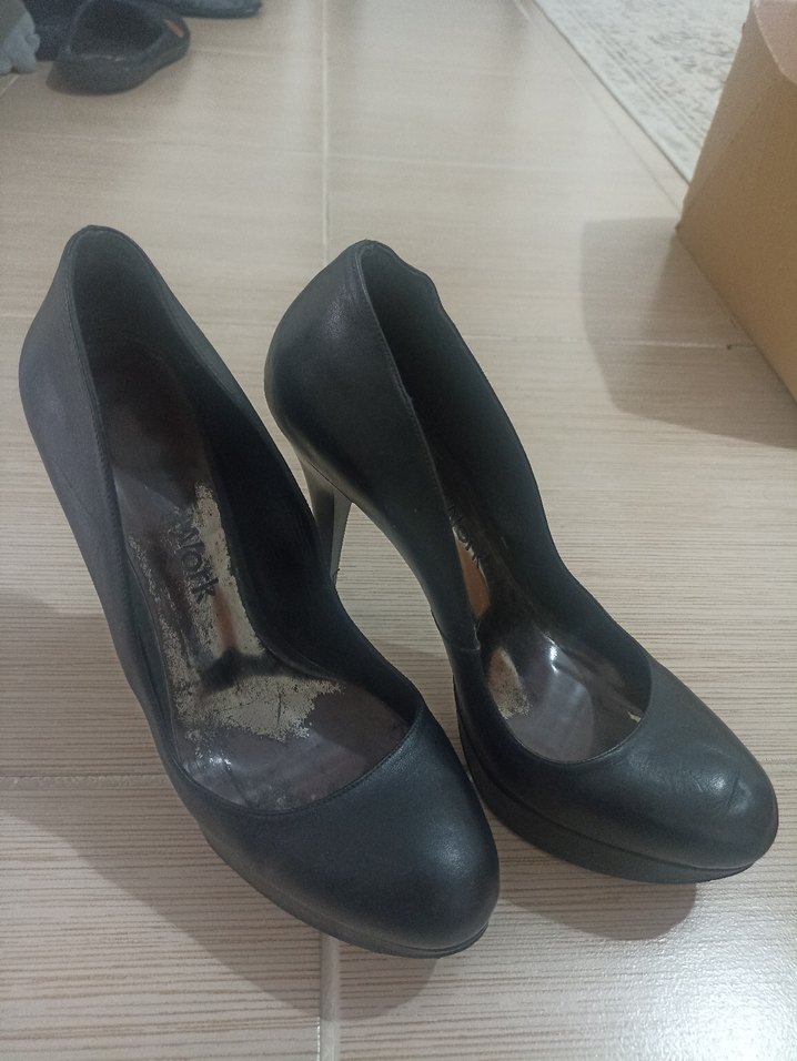 Siyah lastik stiletto topuklu ayakkabılar, tokalı detaylı, klasik gotik tarzda, ofis kullanımı için uygun. Desensiz ve iddialı tasarım. 38numara
