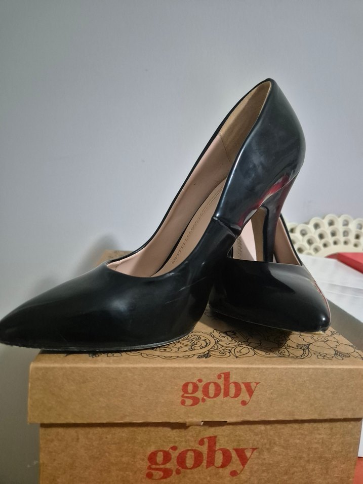 Siyah, lastik malzemeden yapılmış stiletto topuklu ayakkabılar, ofis için modern klasik şıklık sunar. Marka: vouge