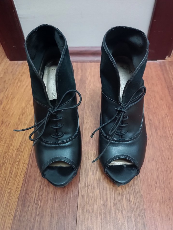 Siyah stiletto topuklu kadın botlar, tokalı detaylı ve kauçuk malzemeden. Gotik tarzda, romantik akşamlar için uygun, desensiz ve şık. iade yoktur