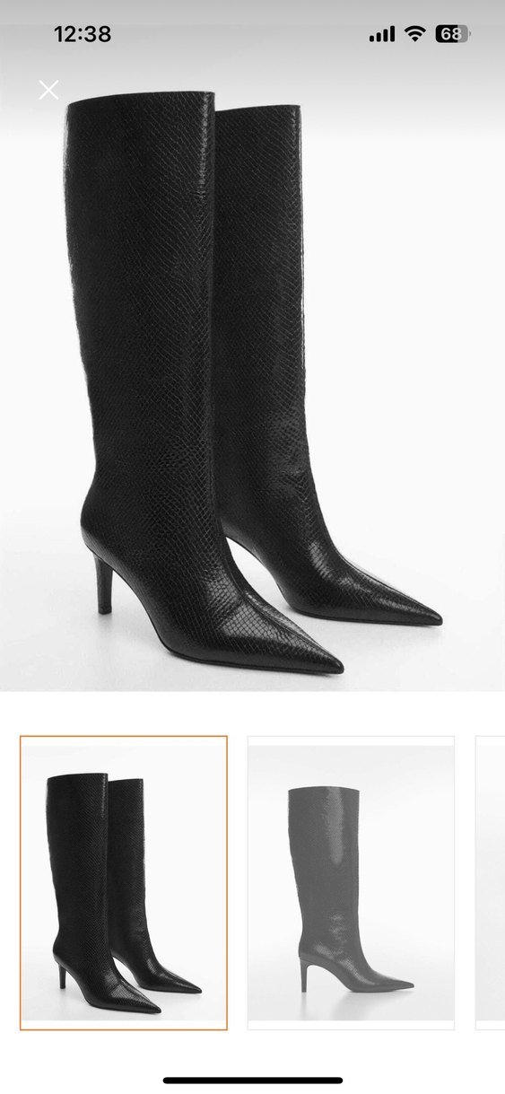 Deri, yılan desenli, siyah stiletto topuklu kadın çizmesi, modern ofis stiline uygun. İnanılmaz bi parça. Markası mango 37 numara ama 36 ya daha uygun ben 37 giyiyorum ayağım giriyor ayakkabıya ama sıkı oluyor esner mi bilmiyorum giymedim çünkü. Kullanımı rahat olsun diye ayakkabıcıya 750 lira verip fermuar açtırdım ama dediğim gibi sıkı o yüzden hiç dışarda giymedim evde denedim yalnızca. Çok severek almıştım