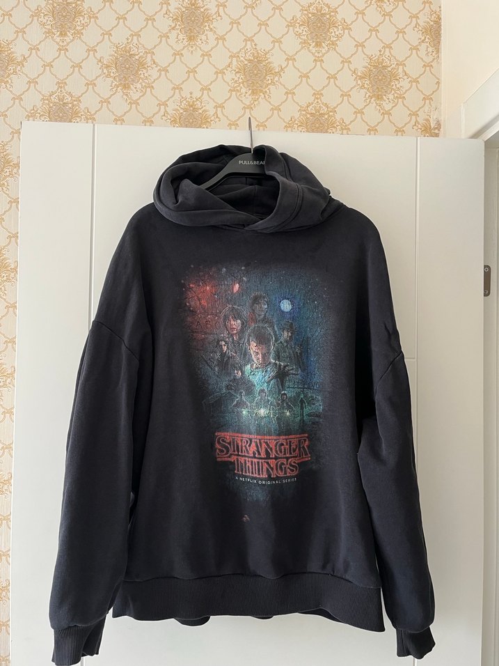 Siyah renkli, Stranger Things baskılı, kapüşonlu sweatshirt. Salaş kesim ve fermuarlı detaylara sahip, yumuşak ve sıcak kumaştan üretilmiştir.