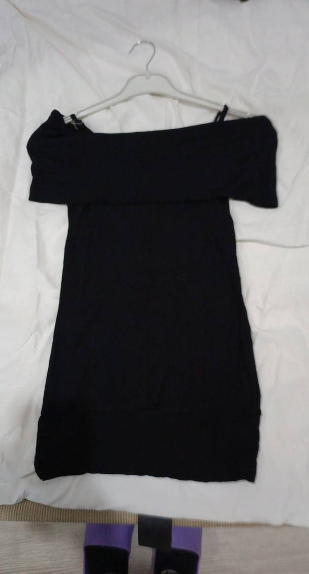 Bu siyah triko elbise/kazak, straplez yaka ve kısa kollu, drapeli tasarımıyla minimalist gotik tarz sunar, günlük kullanım için uygundur.