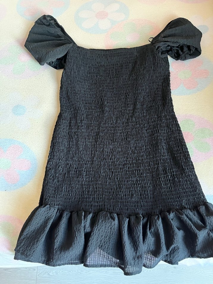 Siyah straplez mini elbise, kısa kabarık kollu ve fırfırlı etek ucu ile. Yumuşak sentetik kumaştan, vücuda oturan gotik tarzda, günlük kullanım için uygun.