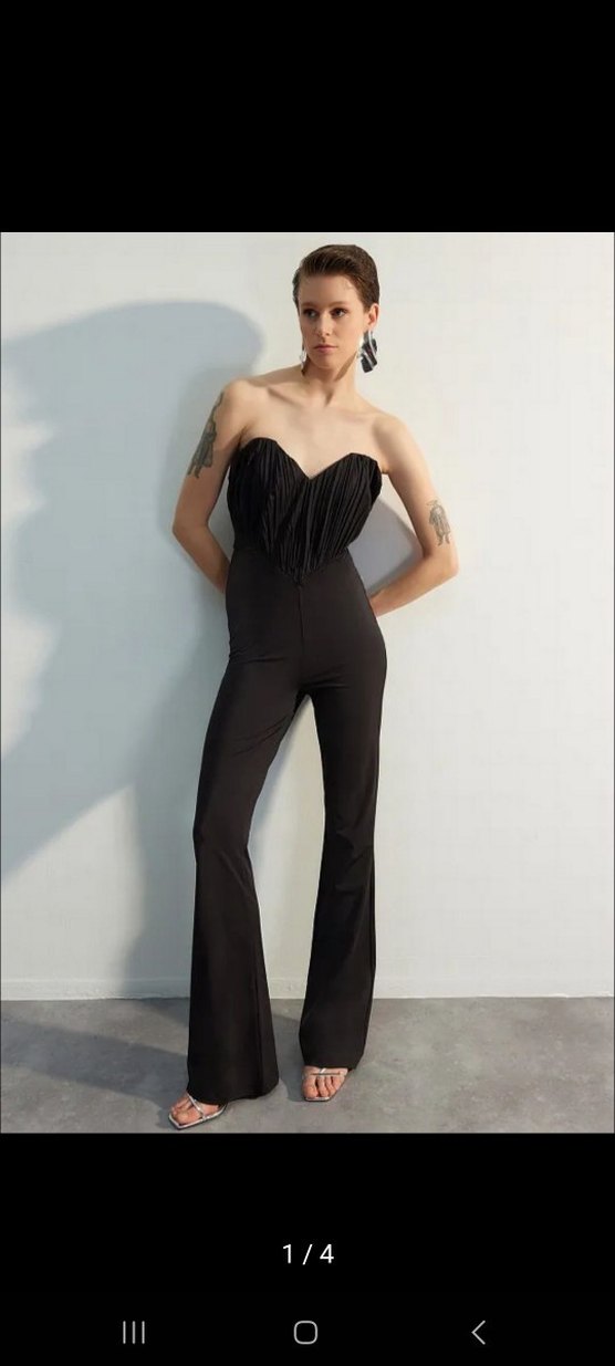 Siyah, straplez uzun tulum, pilili detaylara ve regular kesime sahiptir. Fiziği çok güzel gösteriyor. Sayılı giyildi bir sorunu yok.✨