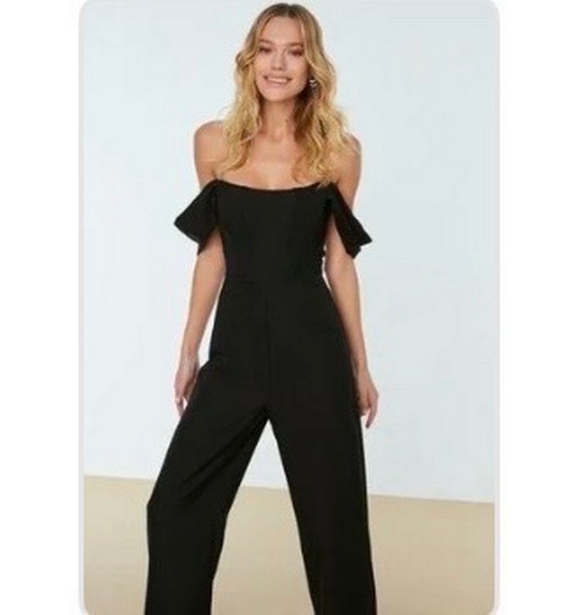 Siyah straplez, askılı kollu, regular fit uzun tulum. Pürüzsüz sentetik kumaştan, şık parti görünümü için uygun. ✨