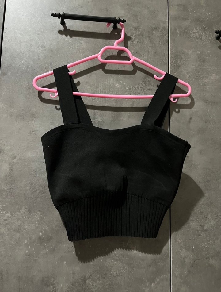 Siyah renkli, strappy askılı ve straplez yakalı, sentetik kumaştan yapılmış dar kesim mini crop günlük kullanıma uygun şık ve cesur bir parça.