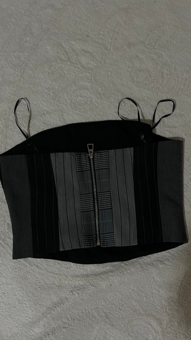 Siyah, dar kesim, askılı ve ön fermuarlı bustier. Kemer detaylı, gotik tarzda, sentetik kumaştan yapılmıştır. Günlük kullanım için uygundur.