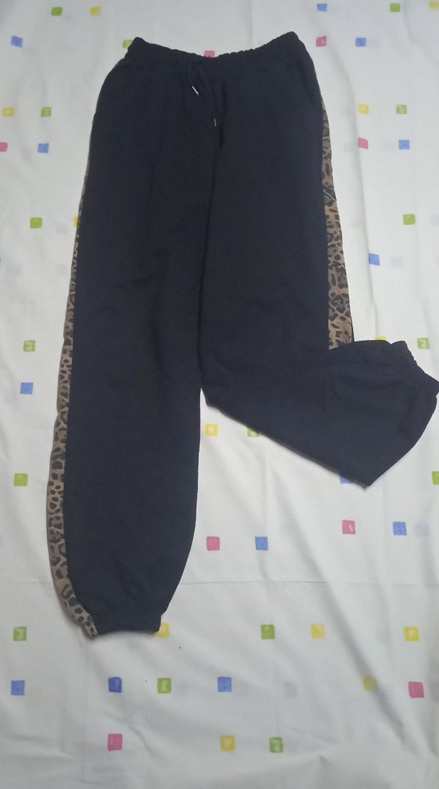 Kadın siyah fleece kumaştan, yanları leopar desenli, bol kesim sweatpant. Cırt cırt detaylı, midi boy, günlük kullanıma uygun.