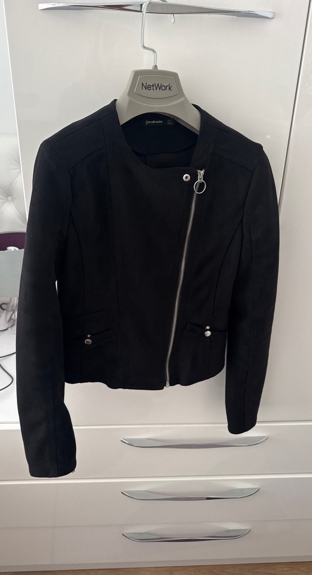 Bu dar kesim siyah süet biker ceket, yaka detayı ve fermuarlı ön kısmıyla trend bir gündelik görünüm sunar. Uzun kollu ve normal midi boydadır. Üzerinde 'NetWork' markası bulunur.