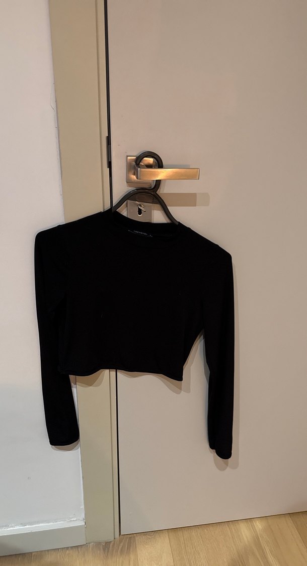 Kadınlar için uzun kollu, dar kesim siyah süet crop top. Minimalist ve desen içermeyen tasarımıyla sokak modasına uygun. ✨