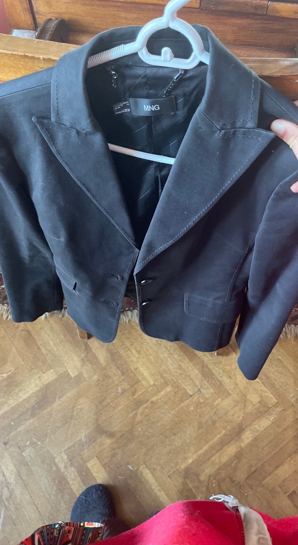 Siyah süet kumaştan yapılmış, düğmeli ve kesik yakalı uzun kollu blazer. Midi boy ve normal kesim, ofis kullanımı için uygun.