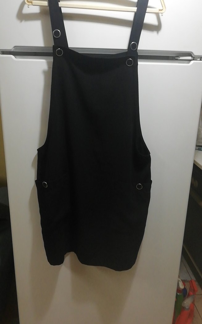 Siyah süet kumaştan, yüksek yakalı ve tokalı askılı, dar kesim kadın kısa tulum. Gotik ve avangart tarzda, günlük kullanıma uygun.