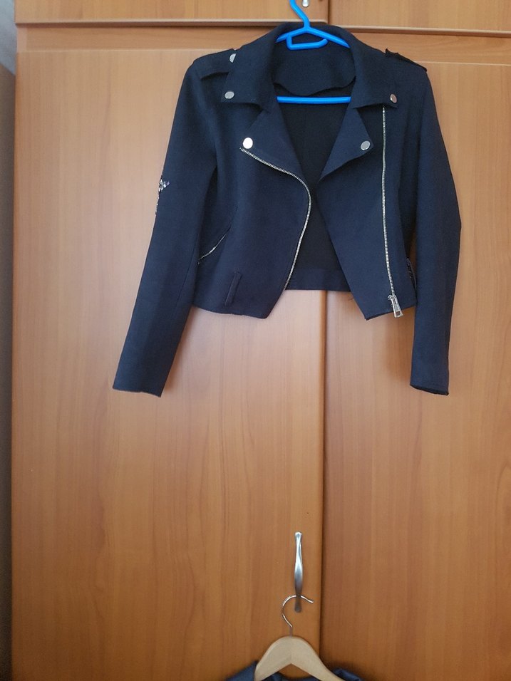 Kadın siyah süet kısa deri ceket, çıtçıtlı yaka ve fermuarlı ön detay sağlar. Strappy kollu, günlük kullanıma uygun rahat kesimdir. temsili marka