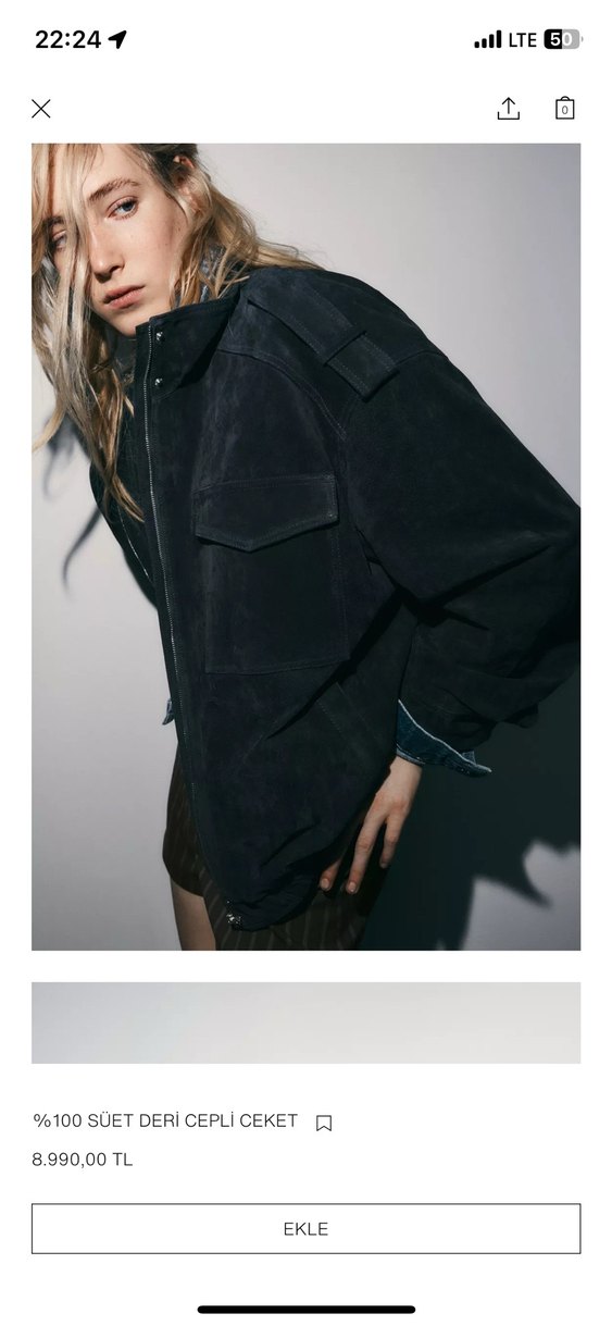 Siyah süetten üretilmiş, bol kesim, yüksek yakalı ve uzun kollu kısa deri ceket. Fermuarlı detaylara sahip, günlük sokak stili için uygun.