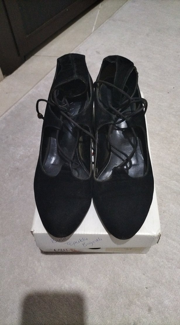 Siyah süet malzemeden blok topuklu, tokalı kadın gece ayakkabısı. Gotik ve Paris tarzında, romantik akşamlar için ideal.