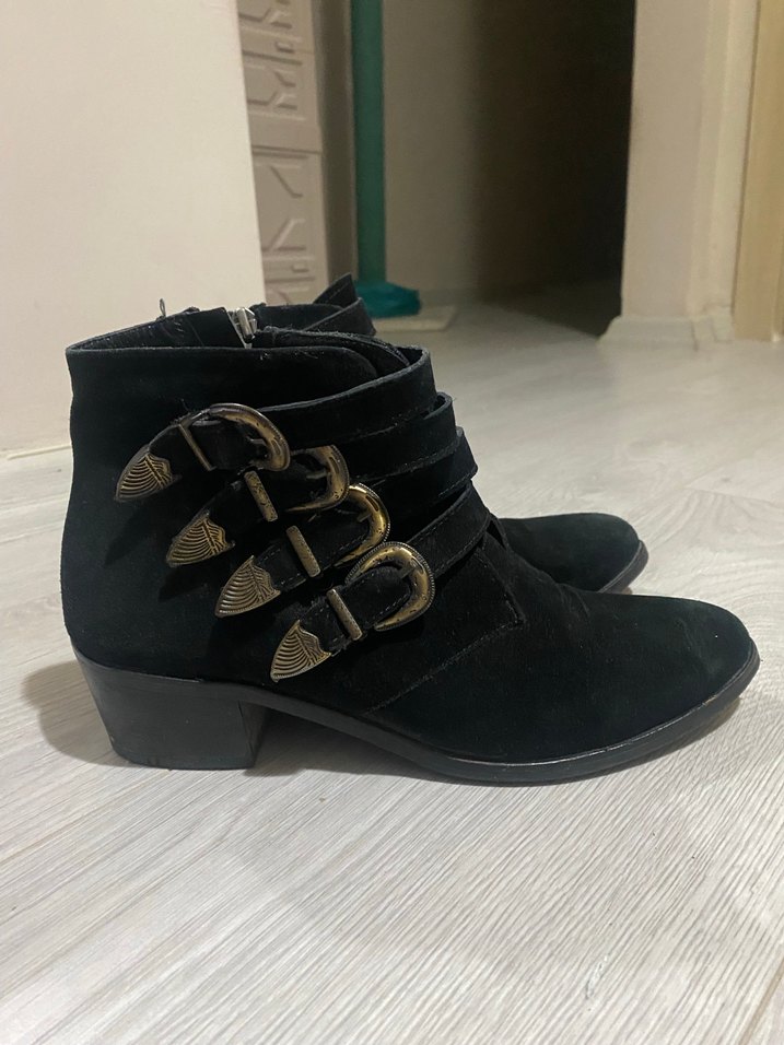 Siyah süet malzemeden, üç tokalı dekoratif detaylı, blok topuklu kadın botu. İnce yılan derisi desenine sahip, trend günlük kullanıma uygun. Hakiki deridir. Hiçbir kusuru yoktur. Çok az kullanılmıştır. Oz markadır.