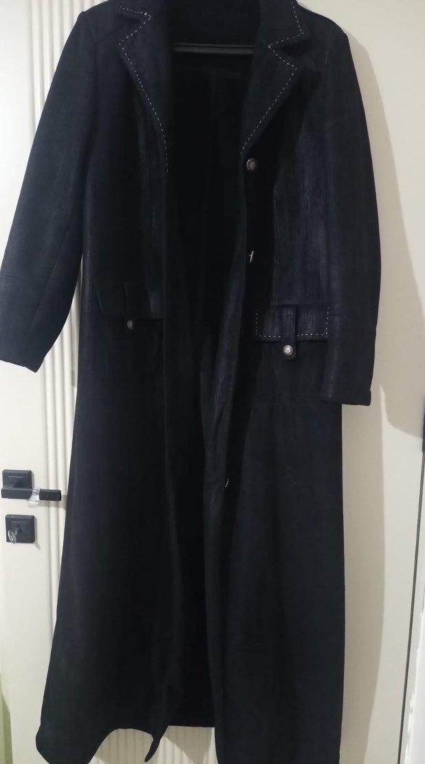 Siyah süet uzun kaban, kesimli yakalı ve düğmeli ön detaylara sahiptir. Regular fit ve uzun kolludur, ofis için uygundur. Goth tarzına sahiptir.