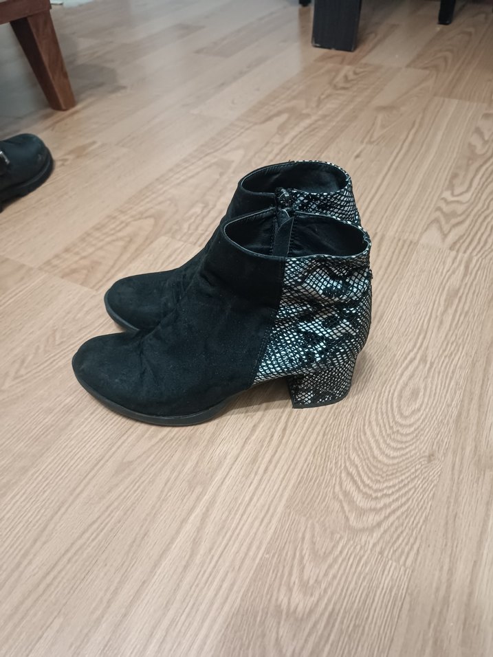 Siyah süet kadın botları yılan desenli, blok topuklu ve tokalı detaylara sahiptir, günlük kullanım için uygundur.