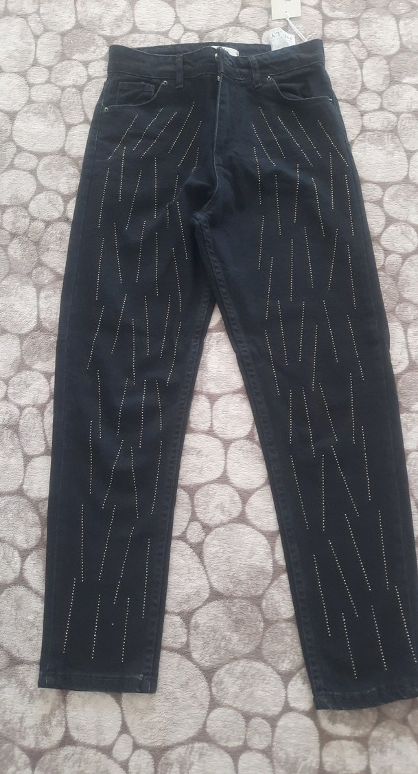 Siyah denim kumaştan, taş detaylı ve kemerli, regular fit midi boy kadın jean. Sokak stili için uygun, günlük kullanıma uygun.yüksek bel