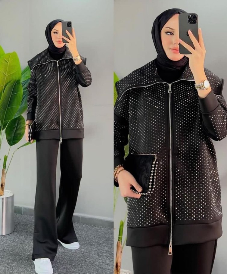 Kadın siyah takımı, normal kesim, uzun kollu ve yakası kesimli. Sentetik kumaş üzerine payet detaylarıyla günlük sokak stiline uygun. ✨