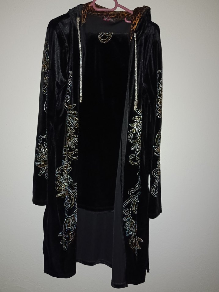 Siyah uzun kadife eşofman takımı nakışlı desenlerle süslenmiş, gotik tarzda, uzun kollu ve regular kesimdir. bır kez giyilmiş yeniden farksızdır