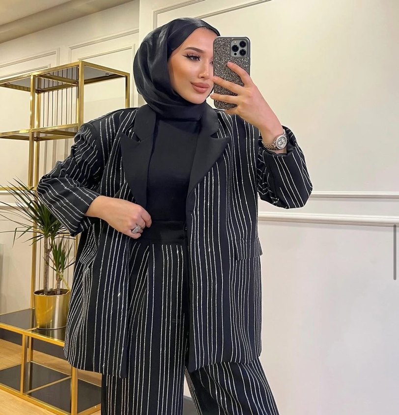 Kadın Siyah taşlı Uzun Ceket takım