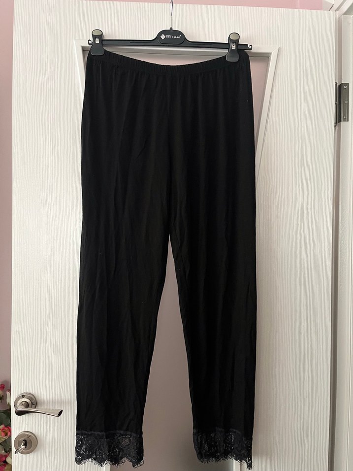 Siyah, ipeksi kumaştan, piliseli ve bol kesimli midi pantolon. Paçalarında dantel detaylar bulunur, günlük rahat sokak stili için uygundur.