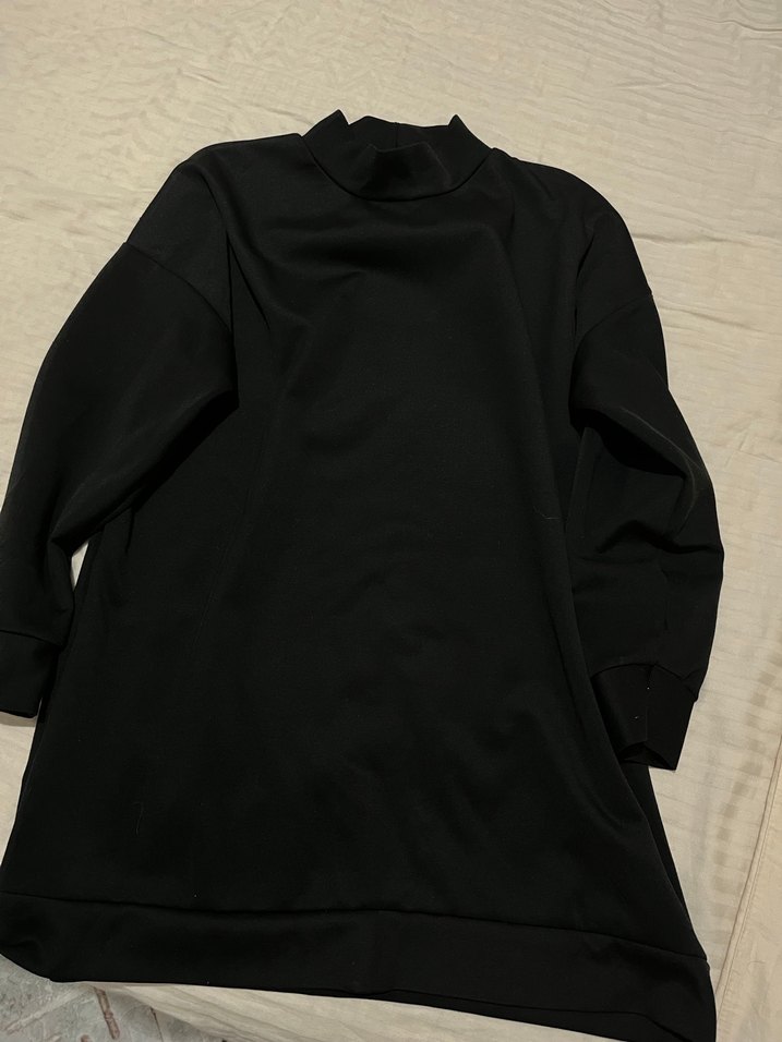 siyah sweatshirt, yüksek yakalı ve uzun kollu, bol kesim, yumuşak ve sıcak kumaştan. Minimalist sokak stili, günlük kullanım için uygundur.