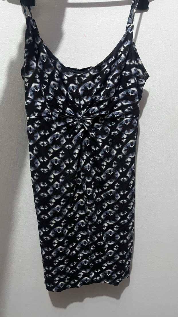 Siyah midi uzunlukta, V yaka ve askılı, drapeli tasarıma sahip dar kesim triko elbisedir. Koyu tie-dye deseniyle trend bir günlük stil sunar.