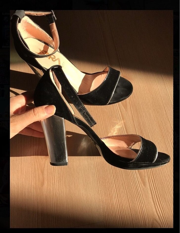 Siyah renk, tokalı ve blok topuklu kadın ayakkabısı. Kauçuk malzemeden yapılmış, romantik akşamlar için Paris tarzında şık bir model.