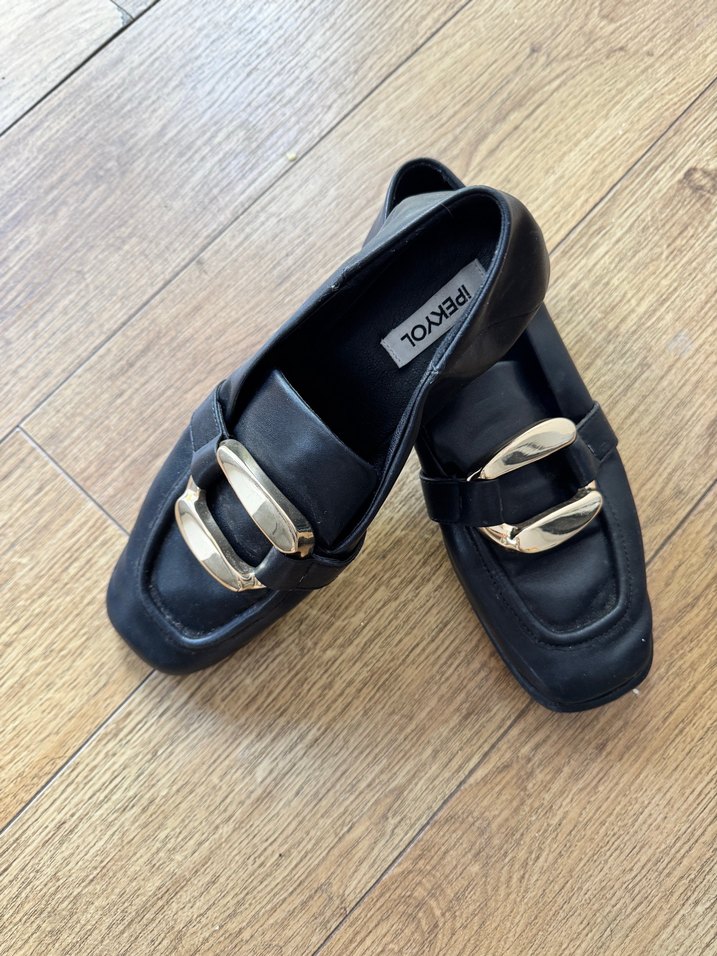 Siyah, tokalı ve blok topuklu kadın loafer. Günlük kullanım için kauçuk tabanlı, klasik ve normcore tarzda. sadece 1-2 kere kullanıldı boya vs yapılmadı orijinal deridir