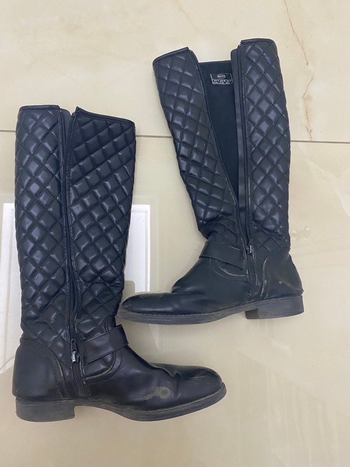 Siyah deri dizüstü bot, kapitone desenli ve tokalı kayışlıdır. Blok topuklu, görselde belirttiğim yerlerde soyulmalar mevcut.