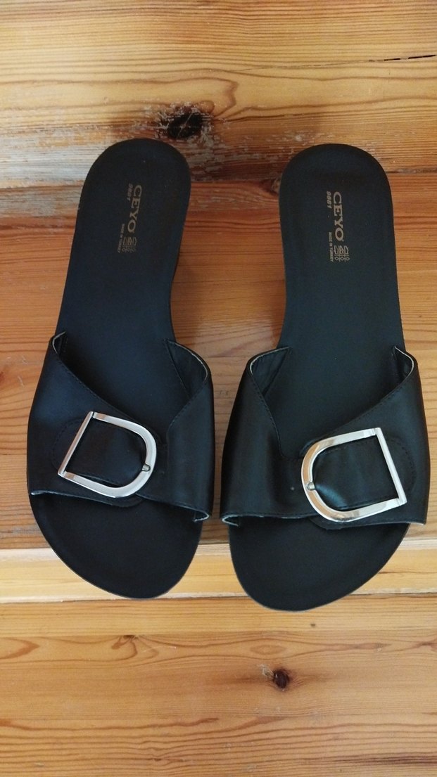 Kadınlar için siyah, tokalı dolgu topuk terlik. Kauçuk malzemeden, minimalist ve sade tasarıma sahip, günlük kullanım için uygundur. Marka: CEYOS.Topuk boyu 5cm