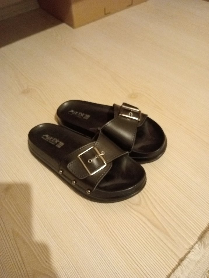Kadınlar için siyah tokalı, dolgu topuklu terlikler. Dayanıklı kauçuk malzemeden, minimalist ve sokak ve ev stili için uygun.hediye geldi kullanılmadı için satıştadır hediye geldiği için etiketi çıkartılmış fiyat bilgisinden dolayı diye düşünüyorum etiketi yok