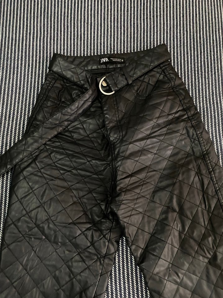 Sentetik kumaştan üretilmiş, tokalı kemerli, düz siyah midi uzunlukta, regular fit kadın pantolonu. Deri pantolon