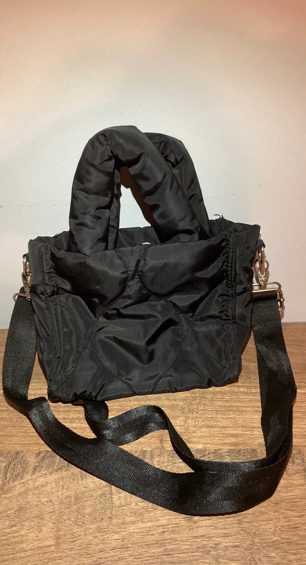 Kadınlar için siyah sentetik kumaştan tokalı, dolgulu saplı çanta. Günlük sokak stili için uygun.